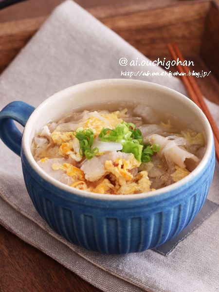 今回は豚肉、春雨、野菜にたまごも入れておかずにもなる具沢山のスープにしました!