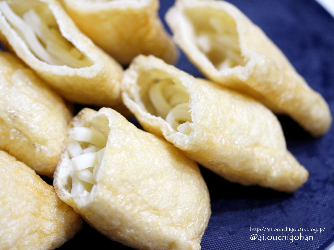 4.厚揚げと油揚げはそれぞれクッキングペーパーで余分な油を拭き取り、油揚げは菜箸をコロコロと転がして半分に切り袋状にしたら8等分にした玉うどんをそれぞれ油揚げの中に詰めて爪楊枝で止め、厚揚げは食べやすく切る。