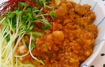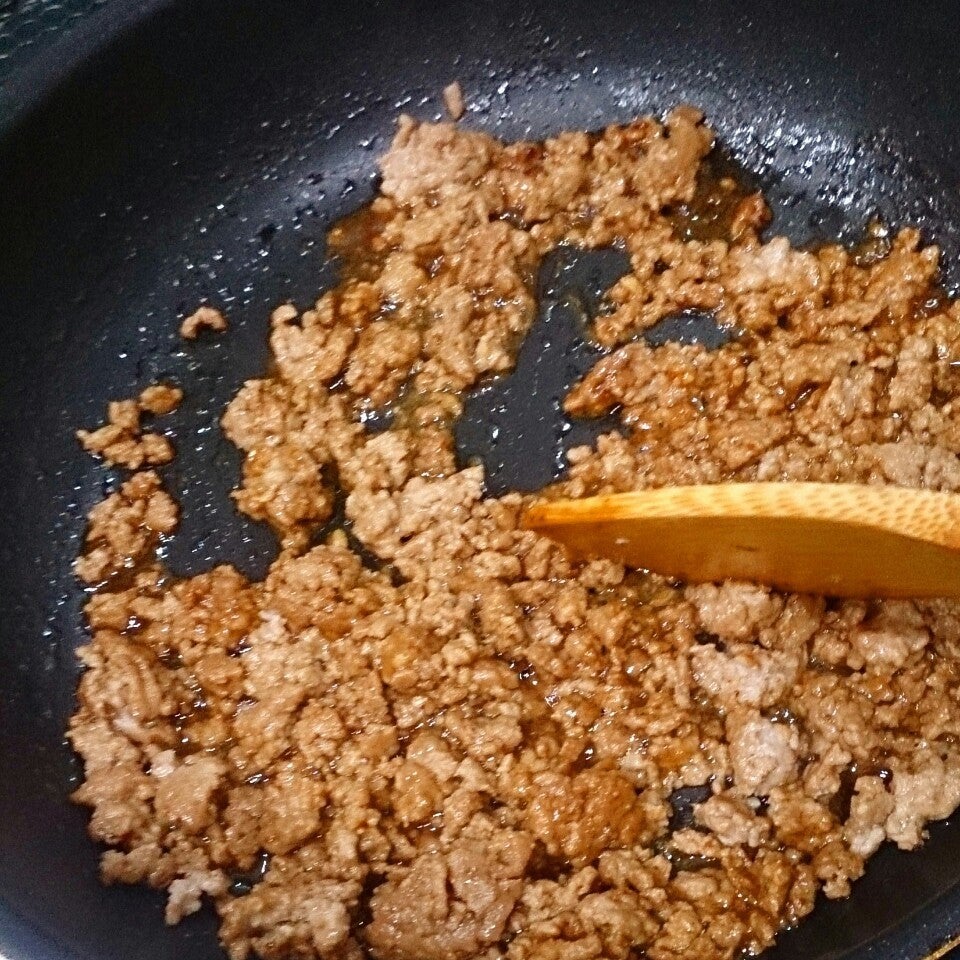 鍋に油をしいてにんにくのみじん切りを炒めて、お肉も揉み込んだタレごといれて→にんじんはすりおろしたのを加える。