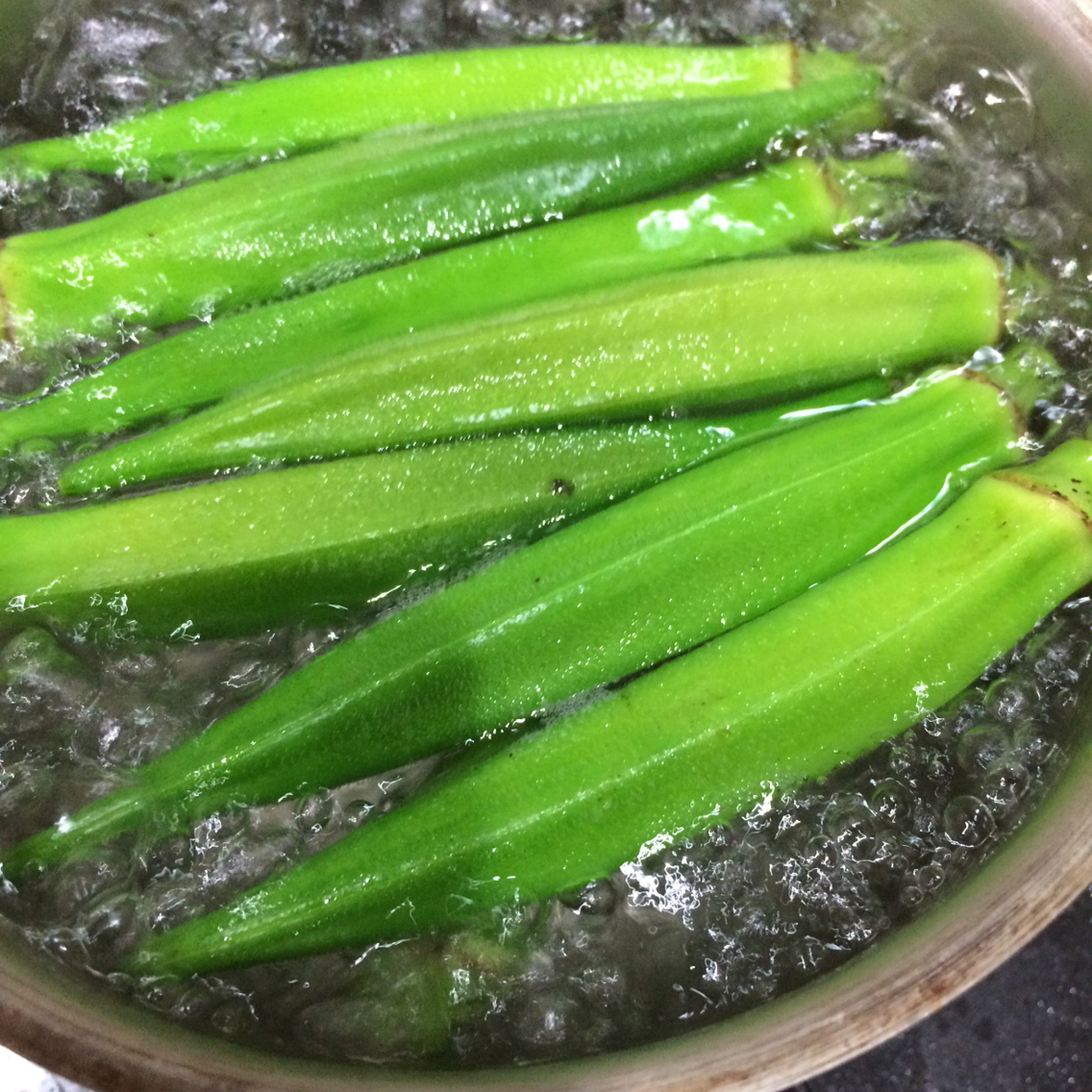 ②オクラはまな板でゴロゴロして産毛を取ったら塩茹でしてヘタを取って食べやすく切り、