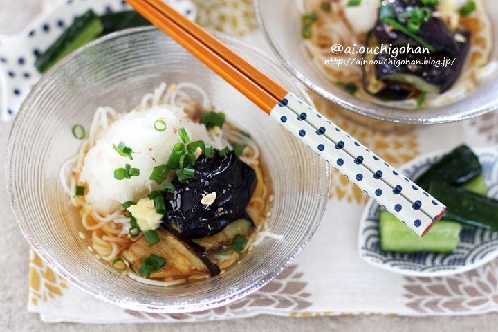 3.器に茹でたそうめんをいれ、素揚げなすと大根おろし、しょうがと万能ねぎをちらしたらめんつゆをかけてお召し上がり下さい!