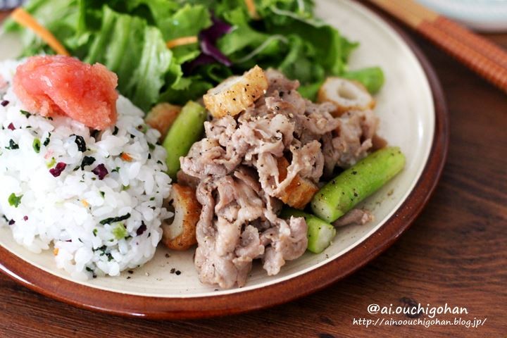 3.豚肉に火が通ったらアスパラも加えてよく炒めアスパラが柔らかくなったらちくわも加えさっと炒める。