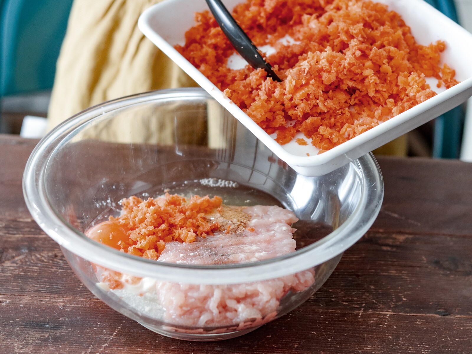 1.たまごは【A】と合わせて混ぜ、たらこは6等分くらいにキッチンばさみで切り、大根の葉は5mm幅程度に切る。