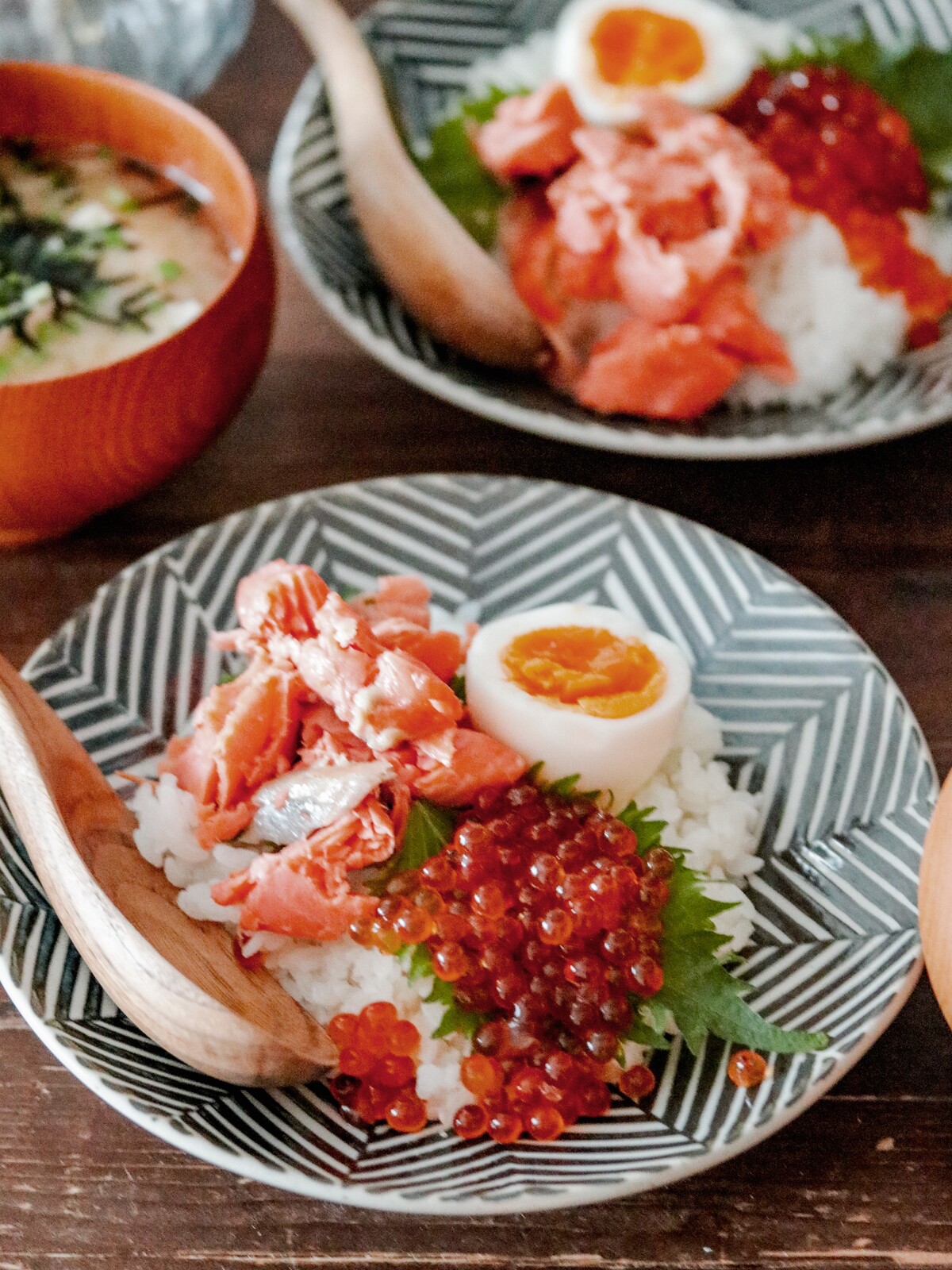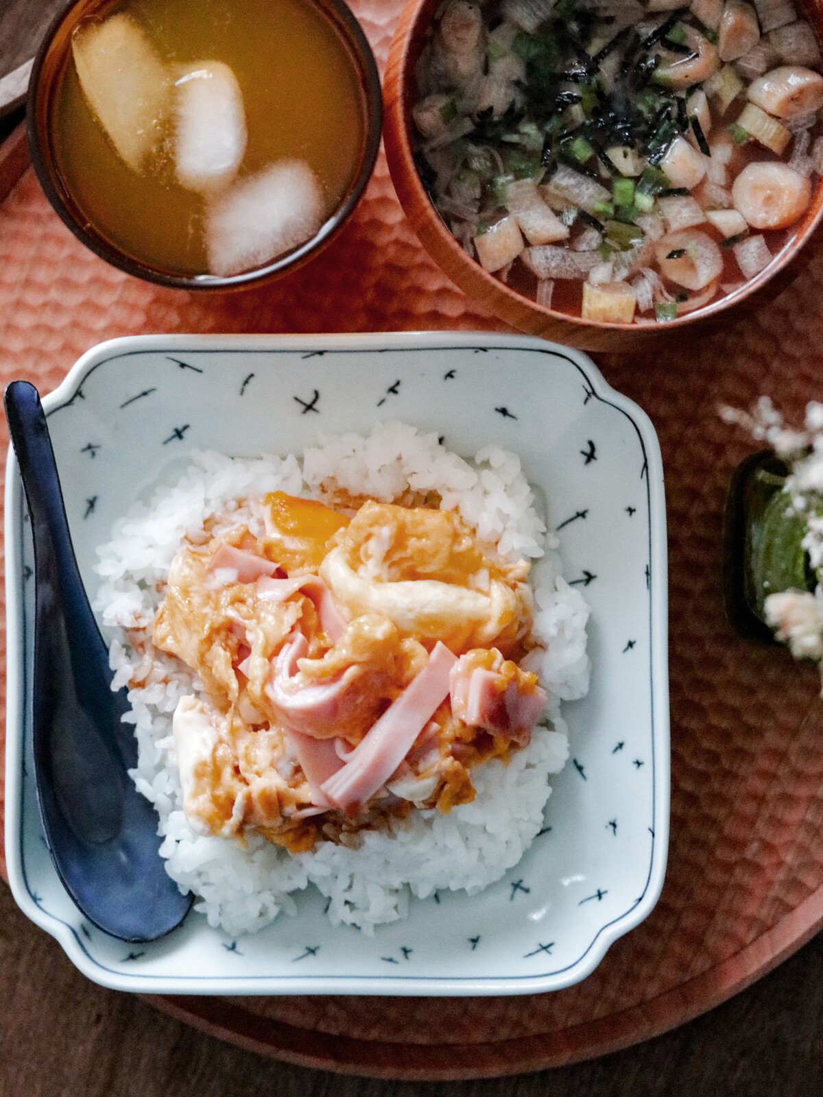 2.ボウルにご飯を入れておき、フライパンにサラダ油を入れて中火で熱し卵を流し入れ炒り卵を作って御飯の上にのせ、あいたフライパンにごま油を入れて大根の葉を炒め、しんなりしてきたら塩で調味する。