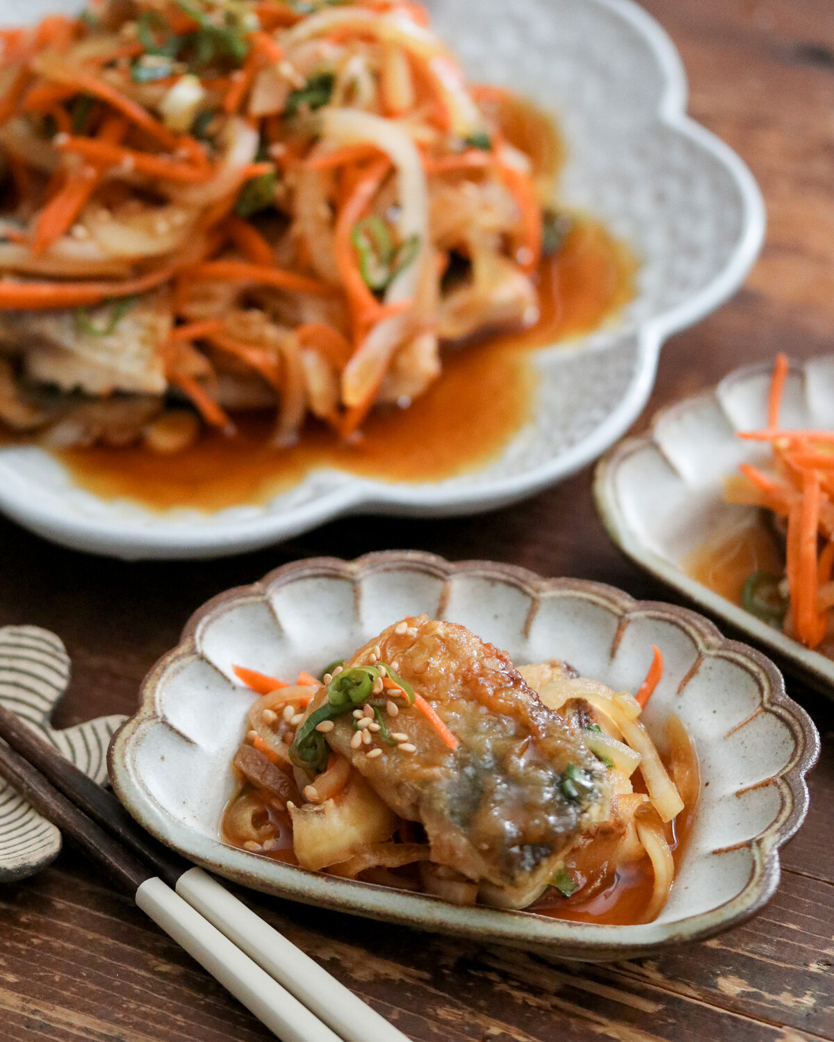 2023年10月20日 レンジ活用で時短♡揚げない鮭の南蛮漬け♡ いつも来てくださりありがとうございます!今日は楽天で買った骨とり済みのお魚を使って作るお手軽な南蛮漬けをご紹介✨無添加 国産 天然 無塩 鮭 切り身 30g×20切 魚 骨取り 骨なし 秋鮭 ...価格:3,402円(税込、送料別) (2023/10/20時点)骨のことは気にしなくて済むとしてちょっと面倒そうなおかずですが野菜の準備もレンジにお任せなのでとってもお手軽なのです❤️とても簡単なのでよかったら作ってみてくださいね!ちなみに塩鮭もあります♡無添加 国産 天然 甘塩 鮭 切り身 30g×20切 魚 骨取り 骨なし 秋鮭 ...価格:3,402円(税込、送料別) (2023/10/20時点)用途に合わせて選べるのが嬉しい♡【揚げない鮭の南蛮漬け】【材料】 (2人分) 調理時間:15分鮭の切り身 3人分たまねぎ 1/2個にんじん 1/4本小麦粉 大さじ1塩 適量サラダ油 大さじ3A ポン酢しょうゆ 大さじ3A 砂糖 大さじ1/2小ねぎ(小口切り)、白ごま 適量【詳しい作り方】1.たまねぎは薄切りにし、にんじんは千切り、鮭は食べやすく切ったらキッチンペーパーで水分を拭き取り、全体に塩をふって小麦粉をまぶす。2.耐熱ボウルにたまねぎとにんじんを入れふんわりラップをかけて電子レンジで2分加熱し、水分が出たらキッチンペーパーで水分を拭き取り[A]を入れてよく混ぜておく。3.フライパンにサラダ油を入れて中火で熱し、鮭を入れて両面しっかり焼き中まで火を通す。4.鮭を2のボウルに入れ和えたらお皿に盛りつけ、小ねぎと白ごまを散らす。【ポイント】*ポン酢しょうゆは[味ぽん]を使用しました。*電子レンジは600wで加熱しました。献立に悩んだときはここから検索と保存が可能です 🍳あいのおうちごはんレシピ検索はこちら🍳レシピブログに参加中♪愛用品はこちらYoutubeで料理動画はじめました♡作り方の動画など載せています!これから増やしていく予定なので・・・♡チャンネル登録&グッドボタンよろしくお願いいたします♡【重版決定*レシピ本発売中】たったこれだけでごちそう! あいのシンプルおうちごはんBEST Amazon/楽天市場書店にてご購入いただけます!レシピ本の内容についてはこちらから毎日の献立に困ったら???【レシピの検索はこちらをクリック】