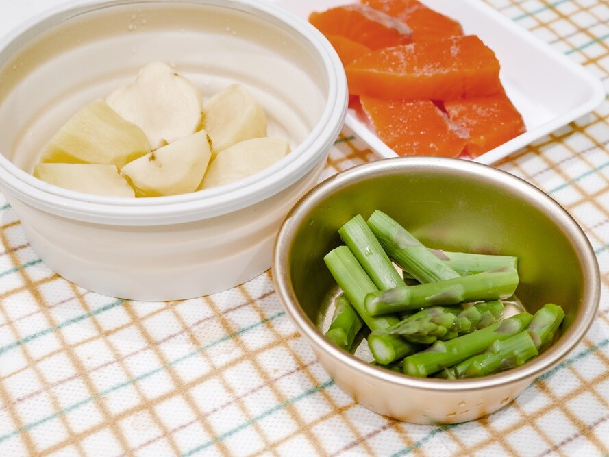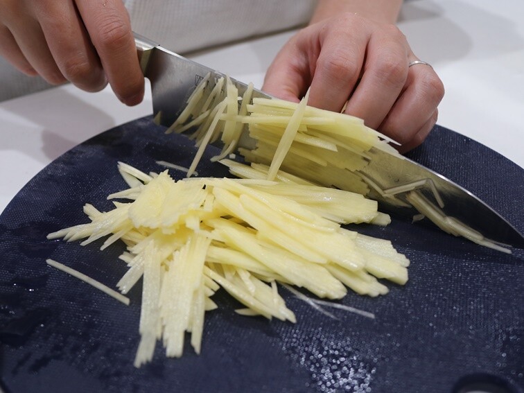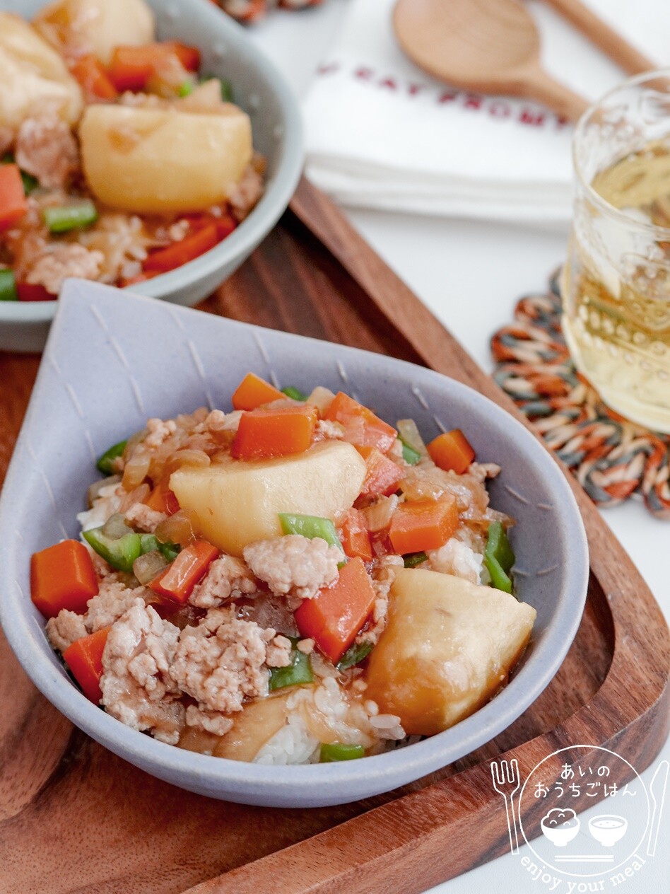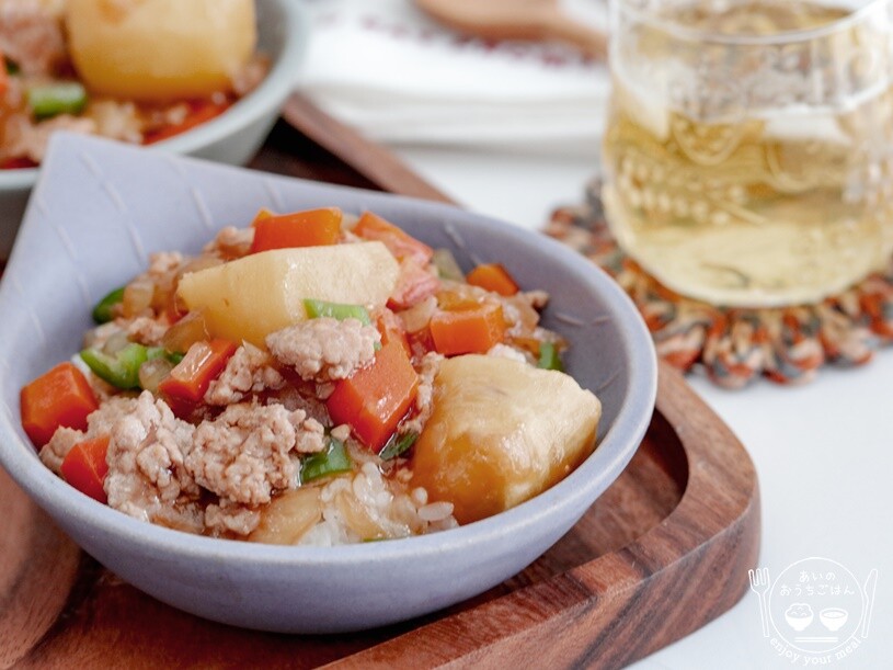 1.じゃがいもは皮をむき食べやすい大きさに切り水にさらし、たまねぎは皮をむき半分に切ってそれぞれくし切り、にんじんは皮をむいて乱切りにする。